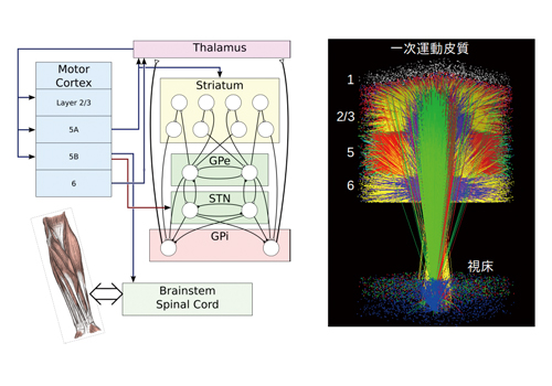 図:左、大脳基底核、視床、大脳皮質の結合関係の模式図。右、構築中の大脳皮質―視床の神経回路モデルの3次元図。