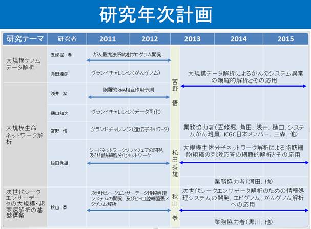 こうした背景の基、本研究開発課題の目標を達成するために、京コンピュータに最適化した最先端・大規模シークエンスデータ解析基盤を整備した上で、生命プログラムの複雑性・多様性や進化をゲノムによって理解する研究と同時に、ゲノムを基軸とした生体分子ネットワーク解析研究を行う。大規模生命データ解析の基礎となるデータは公開されているものを用いる他、データ解析の結果出てくる予測や正当性の検証などについては、国際がんゲノムコンソーシアムをはじめとする大規模ゲノムプロジェクト、がんやメタボリック症候群などの病気に関する大小の病態解析プロジェクトと連携して実施する。それにより、これまで手の付けようの無かった規模のデータ解析を大規模計算で実施し、薬効・副作用予測、毒性の原因の推定、オーダーメイド投薬、予後予測などへの応用に貢献することを目指す。
